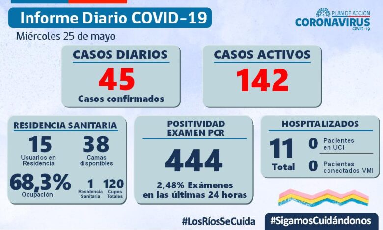 45 nuevos casos de Covid-19 para los Ríos, en tanto los casos activos suman 142