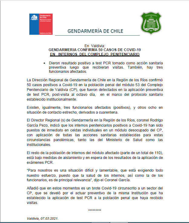 El director regional subrogante de Gendarmería en Los Ríos, el coronel Rodrigo García, confirmó que el brote fue detectado en un control de rutina que se realiza 10 días después de las visitas que reciben los internos del Complejo Penitenciario Llancahue de Valdivia.