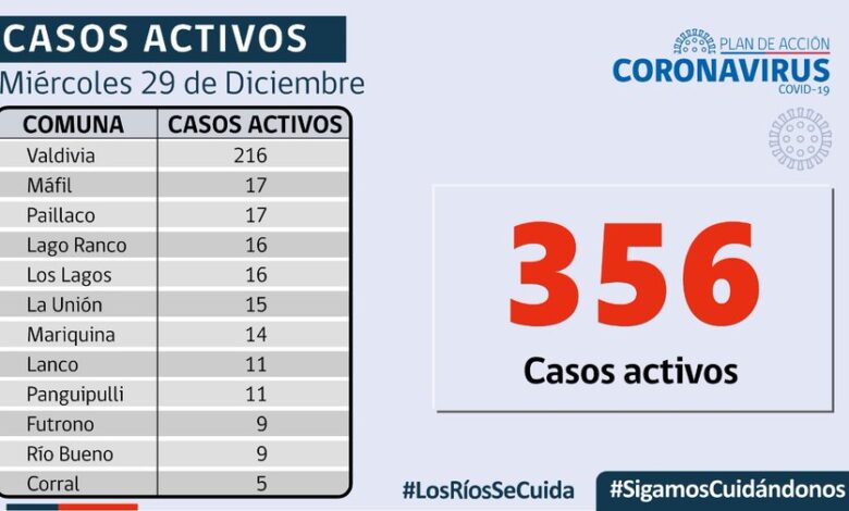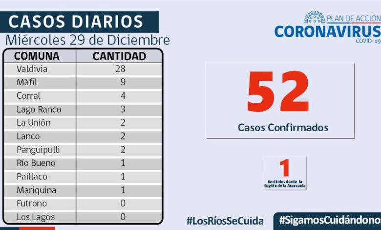 52 nuevos casos confirmados en los Ríos, 890 exámenes procesados positividad de un 4%