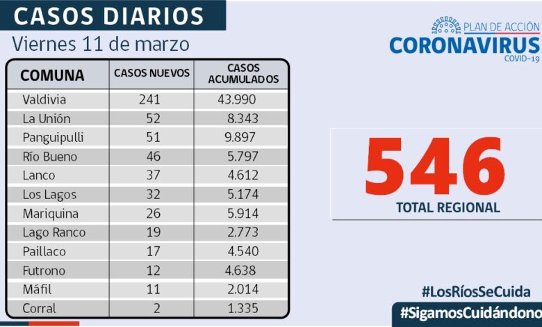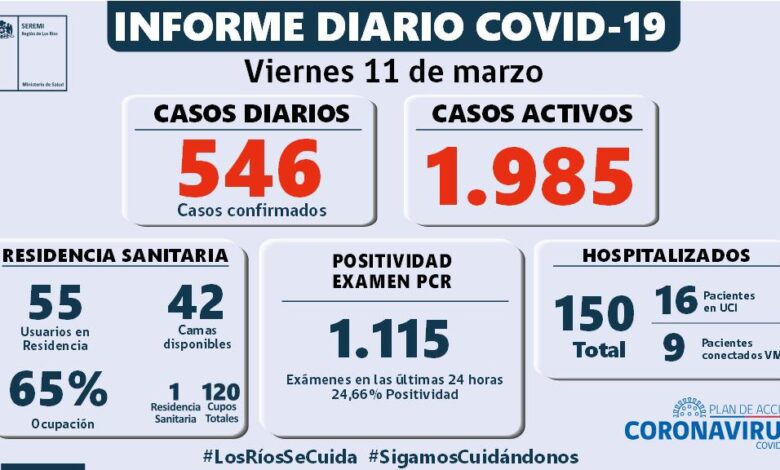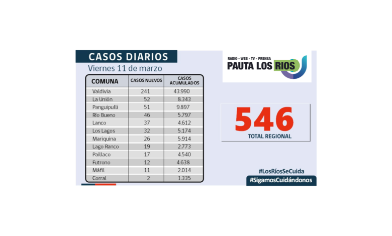 546 nuevos contagiados en los Ríos, 1.115 exámenes informados en tanto la positividad alcanza al 24,66%