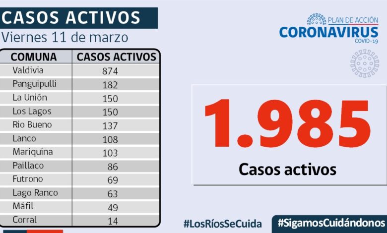 A la fecha, hay 1.985 casos activos, de los cuales 874 corresponden a la comuna de Valdivia y 182 a la comuna de Panguipulli.