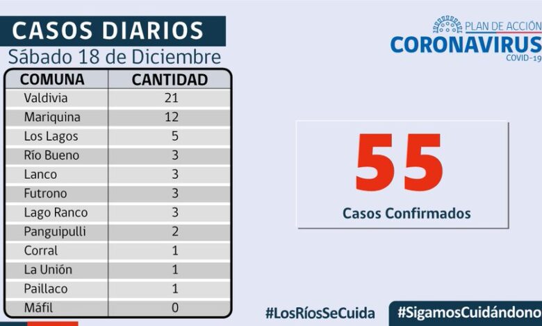 El SEREMI de Salud(S), Leonardo Bórquez, informó que hoy se reportaron 55 nuevos casos de COVID-19 en Los Ríos, a la fecha en Los Ríos hay 308 casos activos, de los cuales 151 corresponden a la comuna de Valdivia y 27 a la comuna de Río Bueno, Durante esta jornada se informó el procesamiento de 1.575 exámenes, con una positividad de 2,4% . En Residencias Sanitarias se mantienen 75 usuarios, lo que representa un 80% de ocupación de camas.