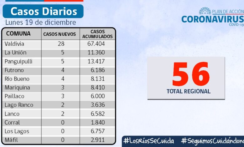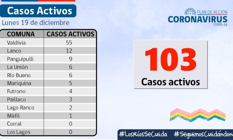 56 casos nuevos reporta hoy la autoridad sanitaria , 103 contagios activos de los cuales 55 corresponden a Valdivia.