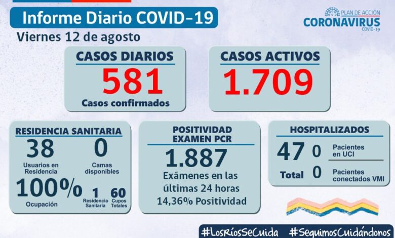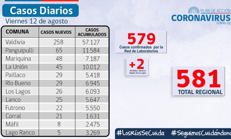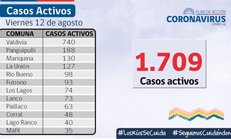 A la fecha, hay 1.709 casos activos, de los cuales 740 corresponden a la comuna de ValdiviaLa Secretaría Regional Ministerial de Salud Los Ríos informó que 579 exámenes resultaron positivos para SARS-CoV-2. Adicionalmente, se recibieron 2 casos desde la Región de Los Lagos, por lo que hoy, se informan 581 nuevos casos de Covid-19 en Los Ríos. Del total, 279 se diagnosticaron mediante test PCR y 302 fueron pesquisados con test de antígeno.
