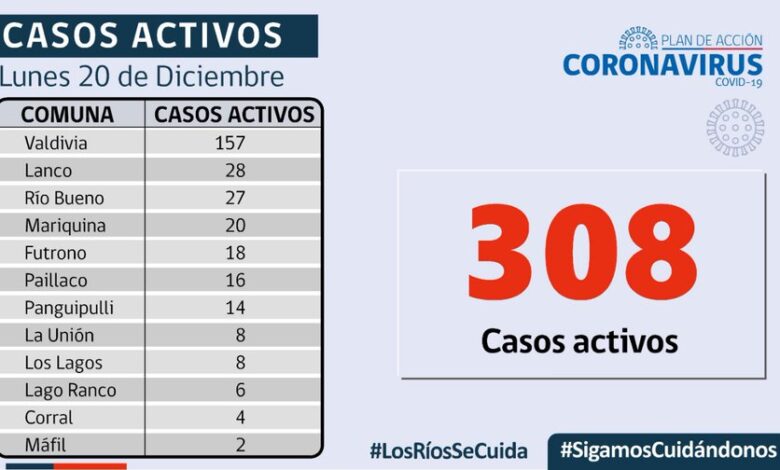 El SEREMI de Salud(S), Leonardo Bórquez, informó que hoy se reportaron 59 nuevos casos de COVID-19 en Los Ríos, a la fecha en Los Ríos hay 308 casos activos, de los cuales 157 corresponden a la comuna de Valdivia y 28 a la comuna de Lanco, hoy, en la Red Integrada de #LosRíos se mantienen 38 personas hospitalizadas, 6 de ellas, conectadas a un ventilador mecánico. Durante esta jornada se informó el procesamiento de 950 exámenes, con una positividad de 5,4%. En Residencias Sanitarias se mantienen 66 usuarios, lo que representa un 74,2% de ocupación de camas.