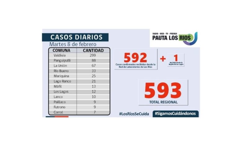 La Secretaría Regional Ministerial de Salud notificó 592 exámenes positivos para SARS-CoV-2 recibidos desde la Red de Laboratorios de Los Ríos. Adicionalmente, se recibe un caso de la región desde la región de Los Lagos. Es así que el total de casos nuevos en la región es de 593.