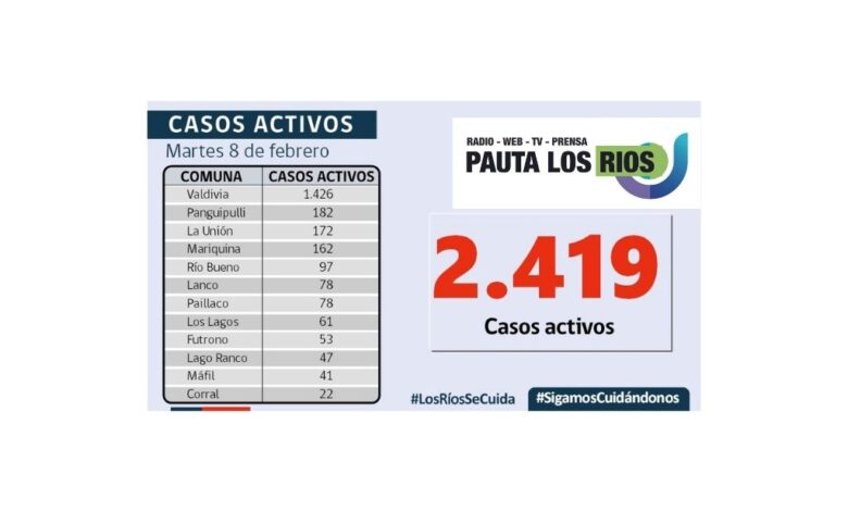 A la fecha, hay 2.419 casos activos, de los cuales 1.426 corresponden a la comuna de Valdivia y 182 a la comuna de Panguipulli.