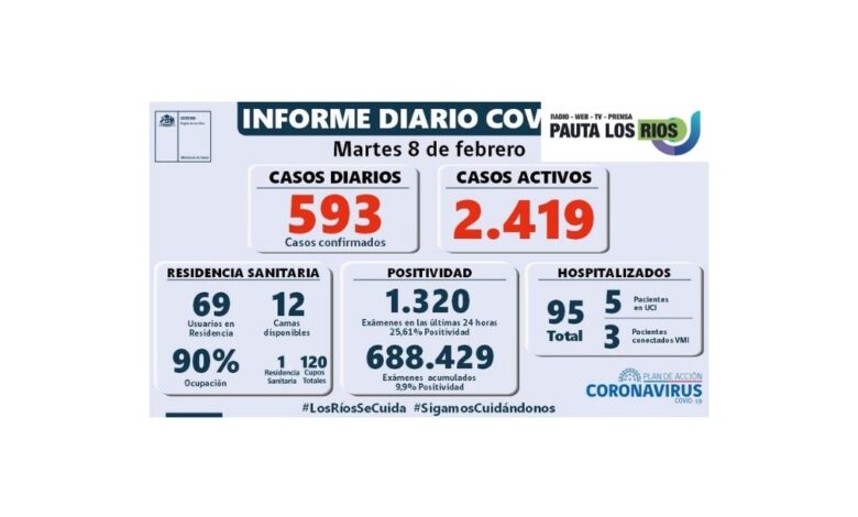 De los 593 casos confirmados por residencia en Los Ríos, 3 corresponden a casos secundarios y 590 están en investigación. En tanto, a la fecha, la región presenta 68.019 casos acumulados, de los cuales 2.419 corresponden a casos activos, 64.879 a personas recuperadas y 721 a fallecidos.