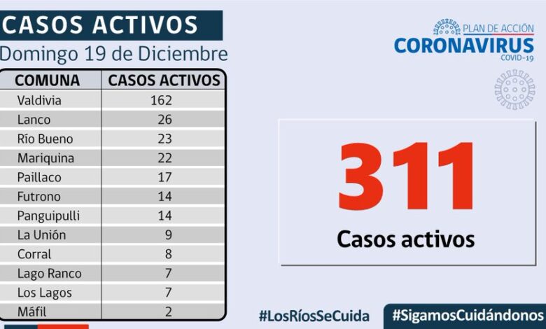 A la fecha en Los Ríos hay 311 casos activos, de los cuales 162 corresponden a la comuna de Valdivia y 26 a la comuna de Lanco.