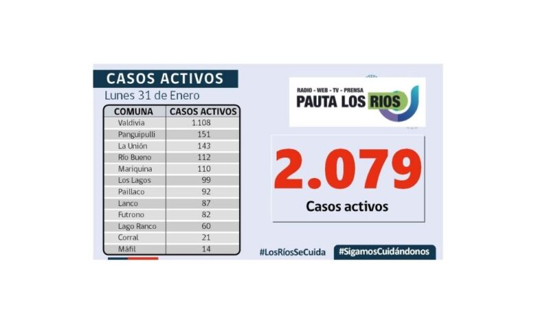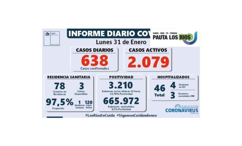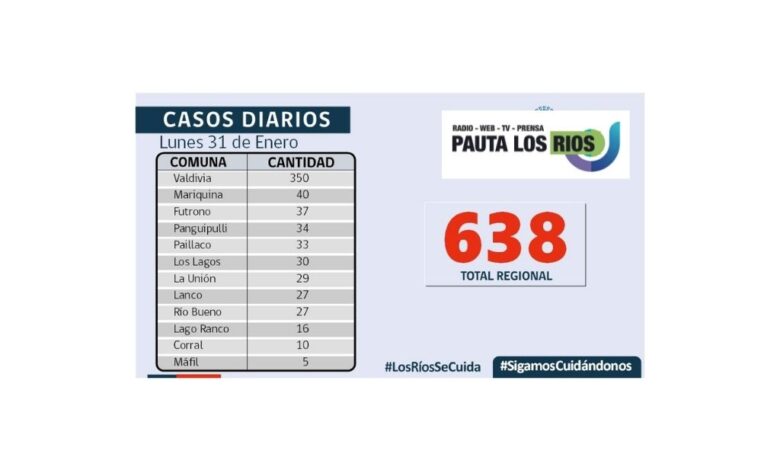 De los 638 casos confirmados por residencia en Los Ríos, 111 corresponden a casos secundarios, 37 aún están sin trazabilidad y 490 están en investigación. En tanto, a la fecha, la región presenta 61.481 casos acumulados, de los cuales 2.079 corresponden a casos activos, 58.688 a personas recuperadas y 714 a fallecidos.