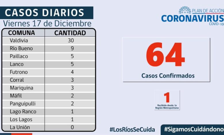 64 casos nuevos de Covid-19 , 1 caso recibido desde la Región Metropolitana.
