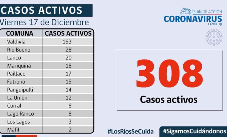 El SEREMI de Salud(S), Leonardo Bórquez, informó que hoy se reportaron 65 nuevos casos de COVID-19 en Los Ríos,a la fecha en Los Ríos hay 308 casos activos, de los cuales 163 corresponden a la comuna de #Valdiviacl y 28 a la comuna de Río Bueno, hoy, en la Red Integrada de Los Ríos se mantienen 36 personas hospitalizadas, 5 de ellas, conectadas a un ventilador mecánico. Durante esta jornada se informó el procesamiento de 1.779 exámenes, con una positividad de 3% ,en Residencias Sanitarias se mantienen 73 usuarios, lo que representa un 80% de ocupación de camas, en esta jornada, se informó el lamentable deceso de 1 persona, de la comuna de Panguipulli.