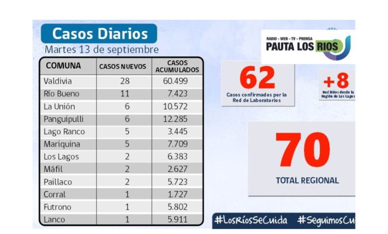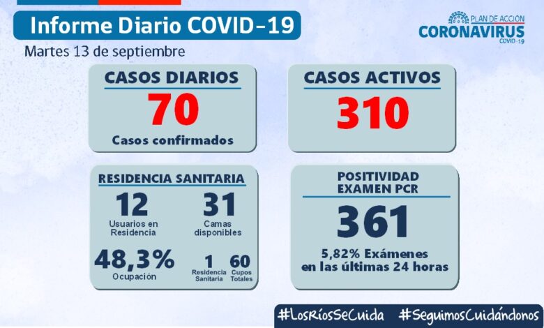 70 nuevos contagios se reportaron hoy Martes y hay 310 casos activos en los Ríos
