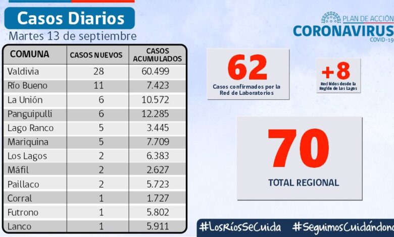 REPORTE] La SEREMI de Salud (S) Dra. Denise Herrmann, informó que hoy se reportaron 70 nuevos casos de COVID-19 en Los Ríos.