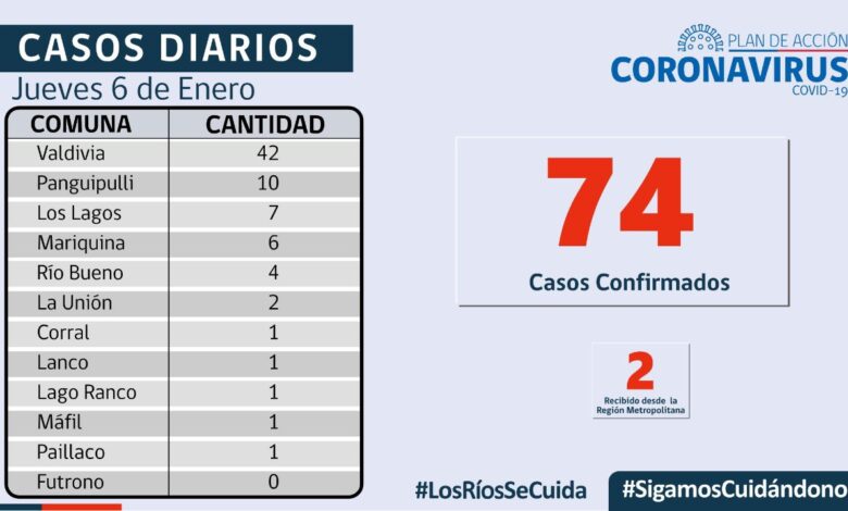 De los 76 casos confirmados por residencia en Los Ríos, 48 corresponden a casos secundarios, 12 aún están sin trazabilidad y 16 están en investigación. En tanto, a la fecha, la región presenta 54.597 casos acumulados, de los cuales 293 corresponden a casos activos, 53.615 a personas recuperadas y 689 a fallecidos.