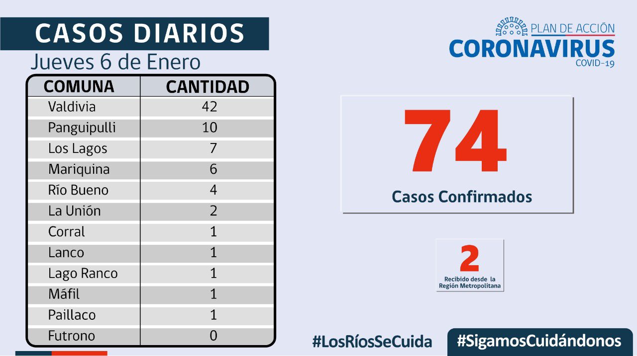 74 casos confirmados en los Ríos, 2 casos de la Región Metropolitana