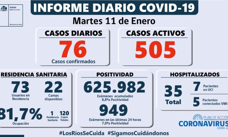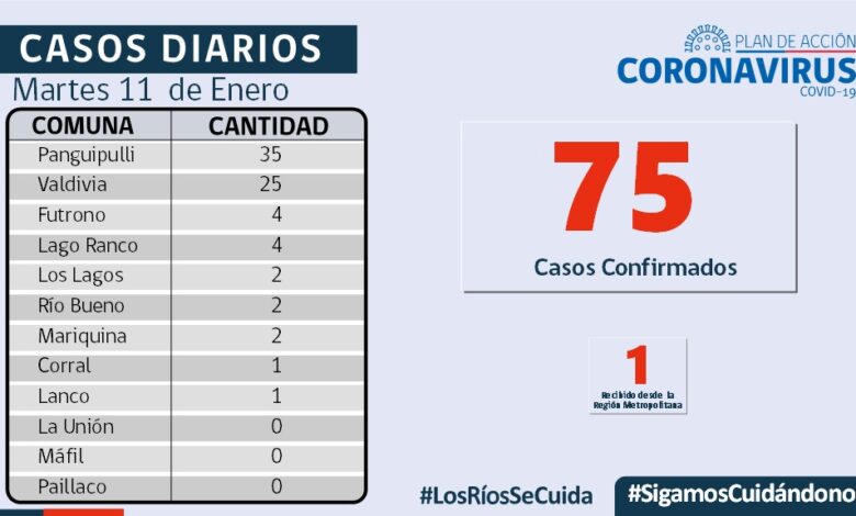 75 nuevos casos confirmados en los Ríos, 1 caso recibido desde la Región Metropolitana