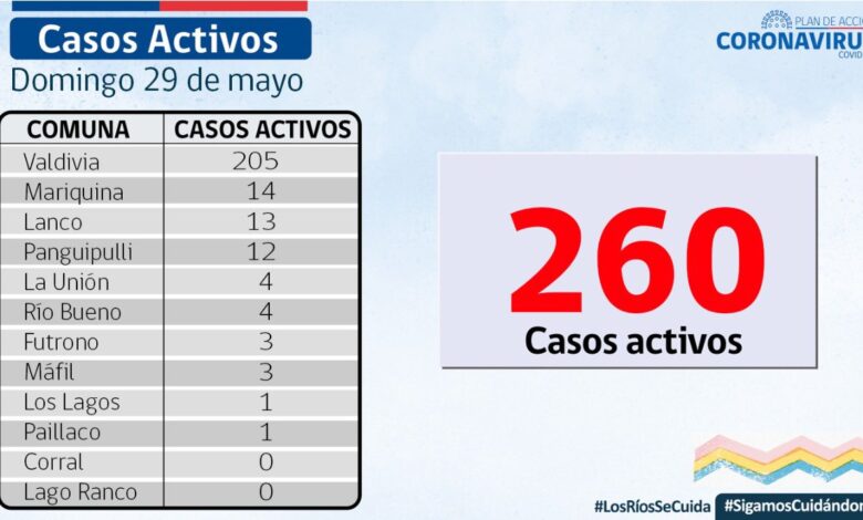A la fecha, hay 260 casos activos, de los cuales 205 corresponden a la comuna de Valdivia y 14 a la comuna de Mariquina.