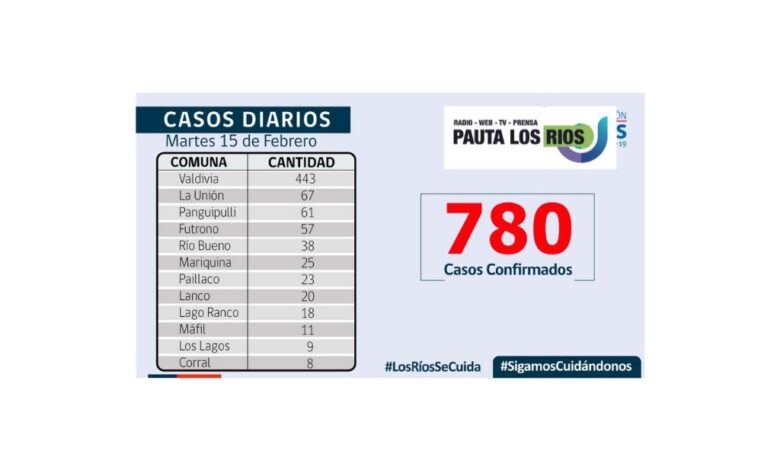 De los 780 casos confirmados por residencia en Los Ríos, 4 corresponde a casos secundarios y 776 aún están en investigación. En tanto, a la fecha, la región presenta 76.600 casos acumulados, de los cuales 3.900 corresponden a casos activos, 71.966 a personas recuperadas y 734 a fallecidos.