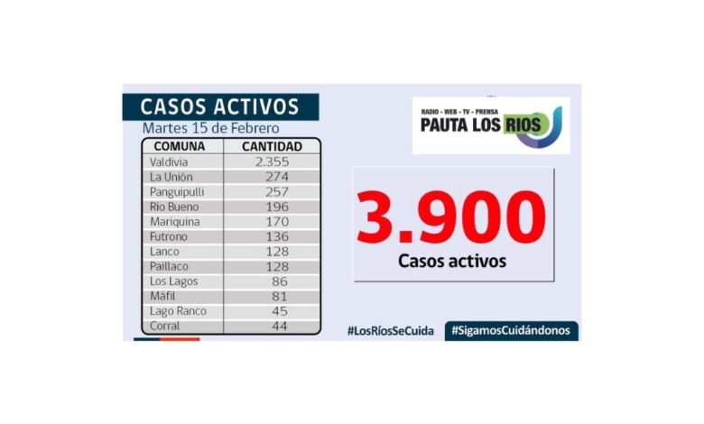A la fecha, hay 3.900 casos activos, de los cuales 2.355 corresponden a la comuna de Valdivia y 274 a la comuna de La Unión.