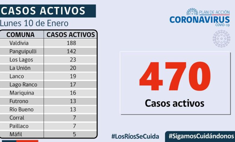 A la fecha, hay 470 casos activos, de los cuales 188 corresponden a la comuna de Valdivia y 142 a la comuna de Panguipulli.