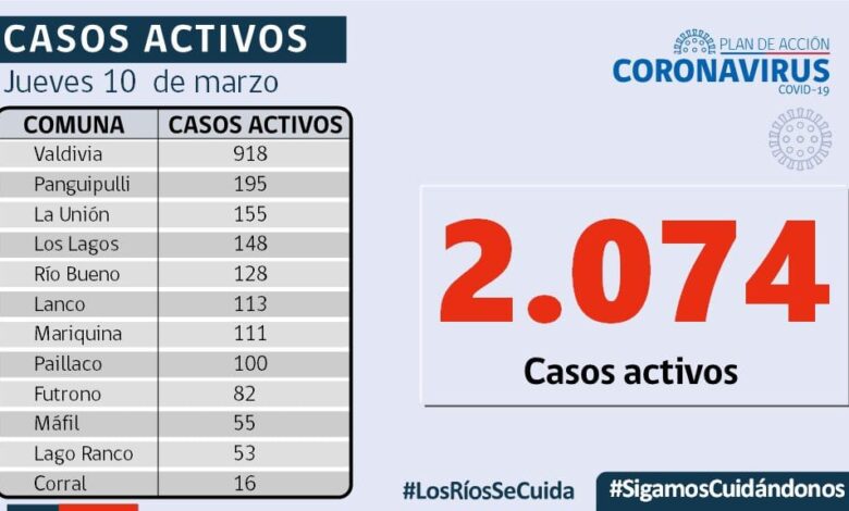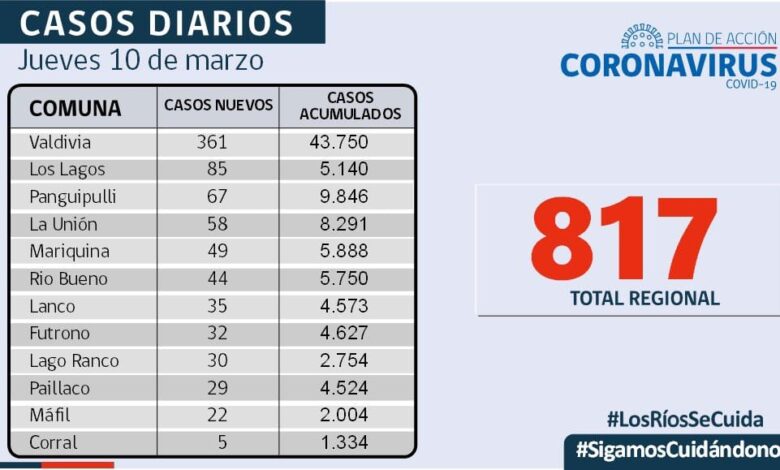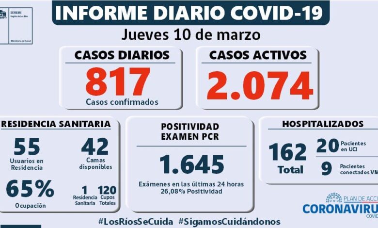 817 personas con contagio positivo en los Ríos , 26,08% la positividad
