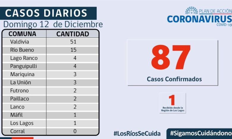 87 casos confirmados en los Ríos , 1 caso recibido desde la Región de los Lagos.