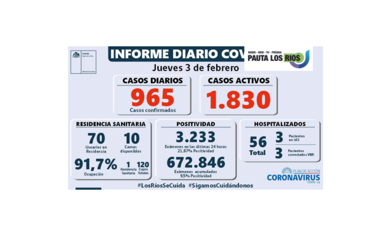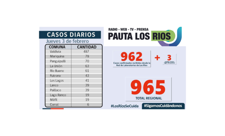 La Secretaría Regional Ministerial de Salud notificó 962 exámenes positivos para SARS-CoV-2 recibidos desde la Red de Laboratorios de Los Ríos. Adicionalmente desde la Región Metropolitana se reciben 3 casos confirmados, por lo que, hoy, en Los Ríos se reportan un total de 965 casos nuevos.