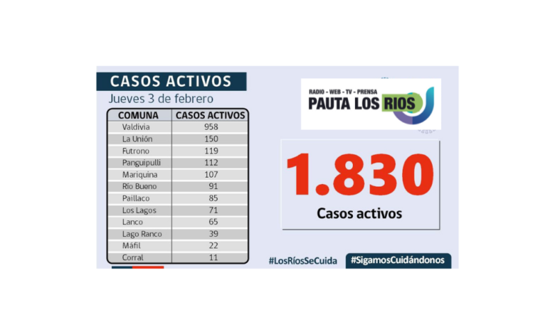 A la fecha, hay 1.830 casos activos, de los cuales 958 corresponden a la comuna de #Valdiviacl y 150 a la comuna de la Unión .