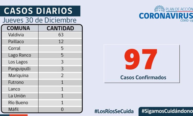 97 casos confirmados en los Ríos, 1.785 exámenes con un 4,5% de positividad.