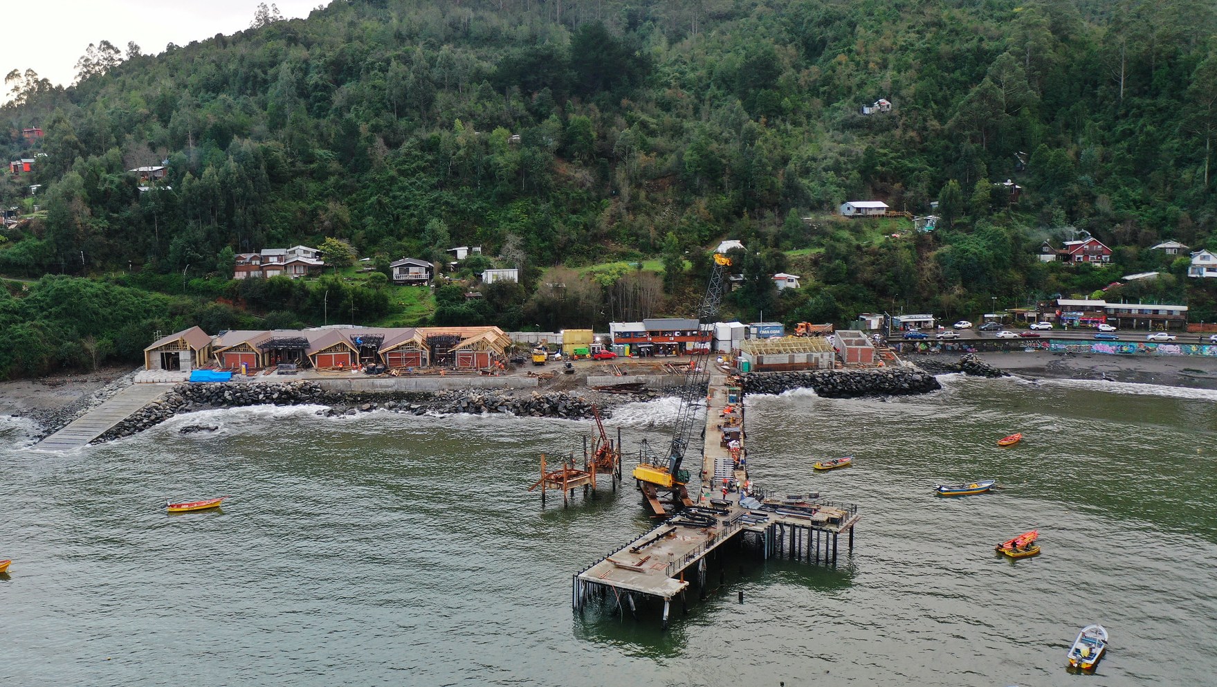 Actualmente se desarrollan faenas de pavimentación de explanada, trabajos de arquitectura y construcción de galpones, además de obras marítimas asociadas a enrocados de protección en el perímetro de la caleta.