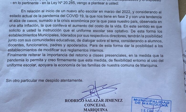 A semanas que se inicie el año escolar Concejal de Mariquina Rodrigo Salazar remitió un oficio al Alcalde Mitre y que busca libertad a las comunidades educativas, para tener flexibilidad con el uniforme escolar