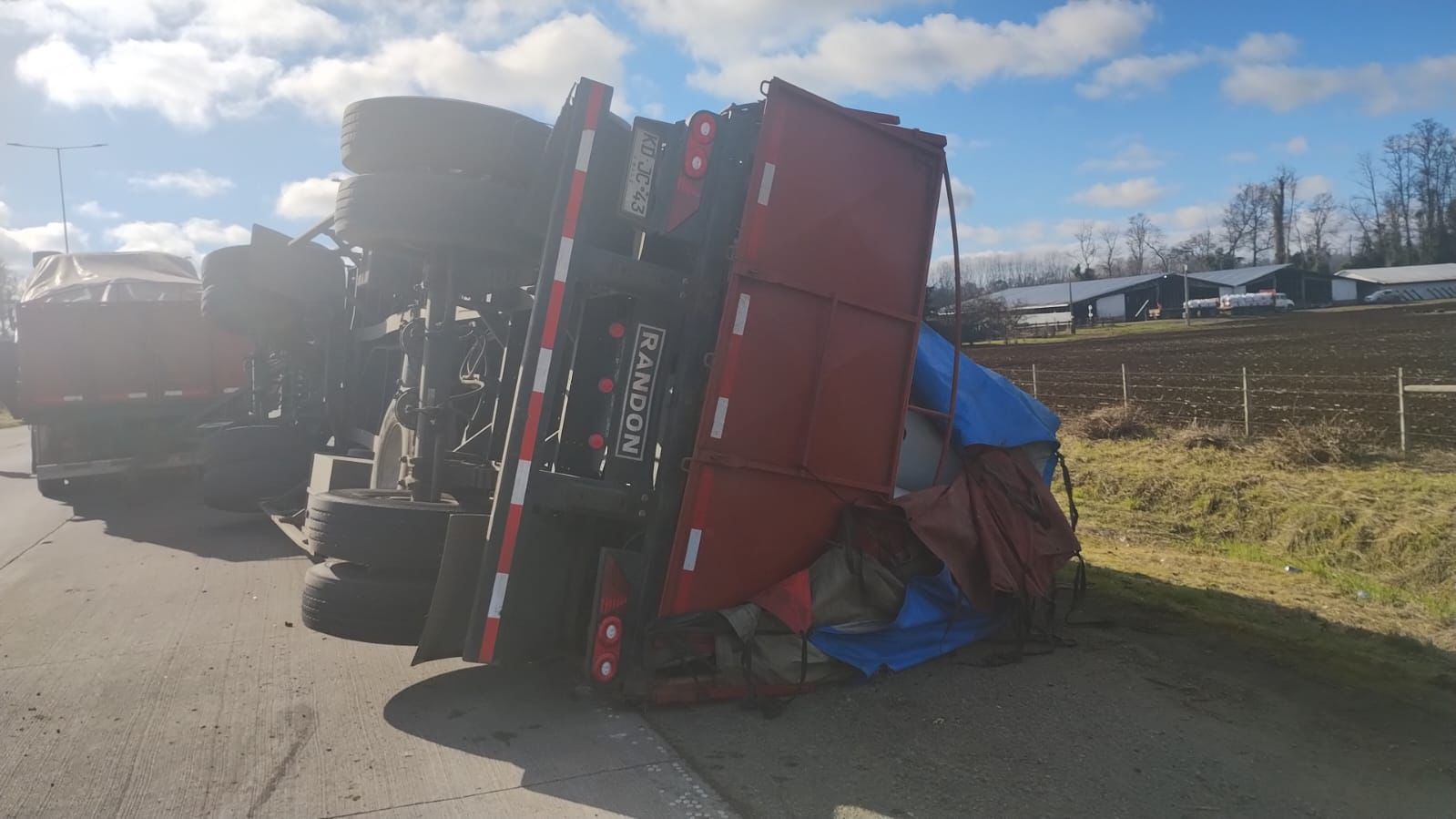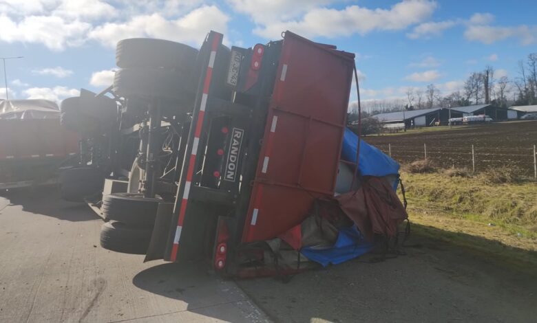 Según reporta Carabineros, a la hora y lugar indicado mediante un llamado a nivel 133, personal de servicio se constituye en un accidente de tránsito, constatando que en la primera pista de circulación de la ruta T-202 sentido sur a norte, se mantenía un remolque con su carga volcado, perteneciente al camión P.P.U DS.RY-46, por lo que al entrevistar a su conductor individualizado como C.A.M.F., 65 años, manifestó que unos momentos antes, mientras conducía el aludido camión en la calle interior acceso Pelchuquín, procedió a realizar un viraje en dirección al norte para ingresar a la ruta T-202, donde por causas que se investigan, el remolque acoplado al camión se volcó, quedando este sobre la berma de la aludida ruta.