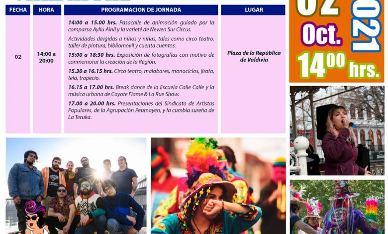 El Programa Aniversario, considera actividades deportivas, culturales, recreativas y protocolares que se llevarán a cabo los días viernes 1, sábado 2 y domingo 3 de octubre, en las comunas de Valdivia, La Unión y Lanco. El tenor de este año es fomentar la participación ciudadana a través de la organización de actividades familiares y comunitarias, para lo cual el Gobierno Regional dispuso un total de 55 millones de pesos.