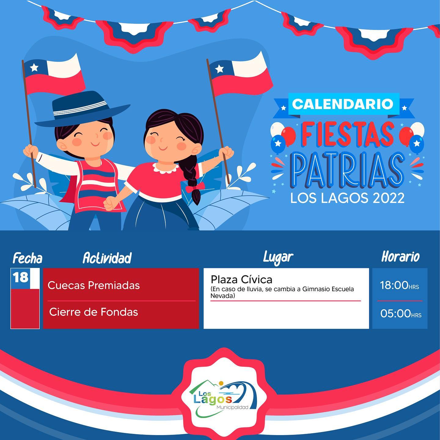 Recordemos que las actividades parten este viernes con el tradicional esquinazo, el que se realizará en el Paseo Peatonal Estación Collilelfu y dentro de las principales actividades, destacan la realización de los tradicionales desfiles, que se realizarán en Riñihue, Antilhue y Los Lagos, sumado a campeonatos de Juegos Típicos, entre otros.