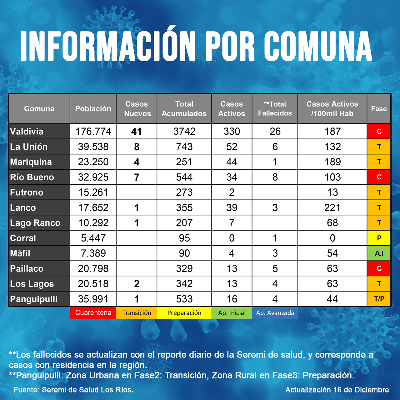 De esta manera, la Región de Los Ríos a la fecha mantiene 554 casos activos por residencia. En tanto, de los casos acumulados a la fecha, 1.630 personas se mantienen en cuarentena obligatoria por ser contactos de alto riesgo.