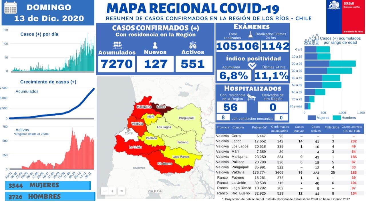 Ahora) En PautalosRios.cl : Compartimos con ustedes el Mapa Regional de Los Ríos En las últimas 24 horas, se procesaron 1.142 muestras, lo que equivale un índice de positividad de 11,1%, en tanto esta semana Mariquina y Lanco serios candidatos a cuarentena total debido a alta cantidad de contagios de las ultimas semanas.
