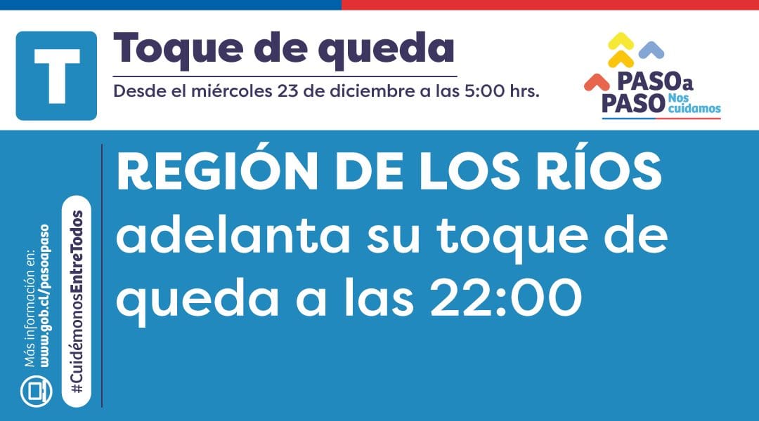 Ahora) En PautalosRios.cl : Les Recordamos que este miércoles comienza a regir el Toque de Queda a las 22:00 hrs. Sin embargo este 24 de diciembre en el marco del Plan Fin de Año este regirá desde las 02:00 a 05:00 hrs