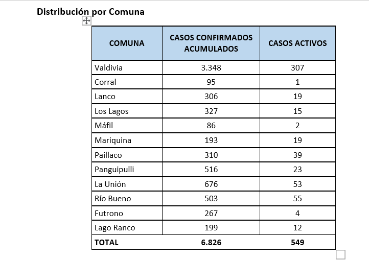 De esta manera, la Región de Los Ríos a la fecha mantiene 549 casos activos por residencia. En tanto, de los casos acumulados a la fecha, 1.309 personas se mantienen en cuarentena obligatoria por ser contactos de alto riesgo.