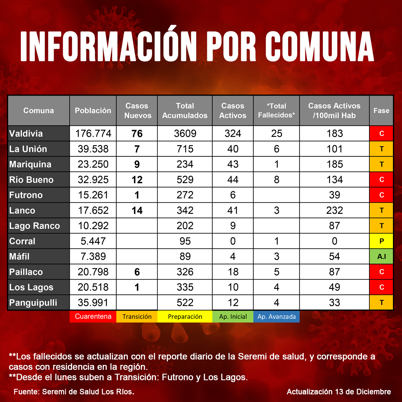 La Secretaria Regional Ministerial de Salud, Dra. Regina Barra, informó que, en las últimas 24 horas, la Red de Laboratorios de Los Ríos ha confirmado 127 nuevos casos de Covid-19 mediante examen PCR. El detalle es el siguiente:
