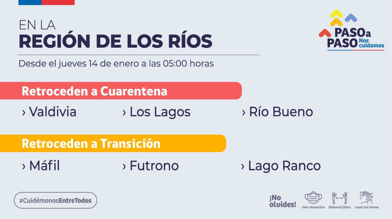 Ahora) En PautalosRios.clRadio: Desde el jueves 14, las comunas de #Valdiviacl #LosLagos y #RíoBueno retroceden a Cuarentena; mientras que las comunas de #Máfil #Futrono y #LagoRanco retroceden a fase de Transición. https://t.co/7fzWMXxcPT