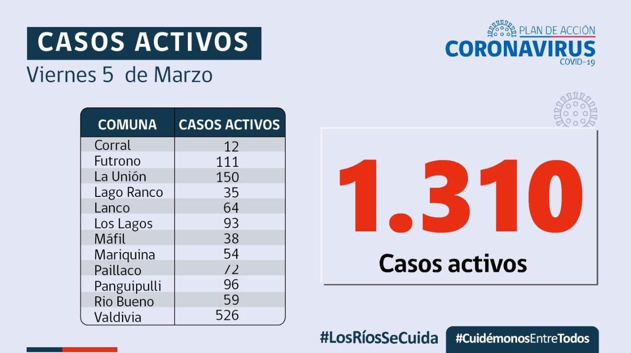 Ahora) En PautalosRios.clRadio) Esta jornada en Los Ríos se mantienen 1.310 casos activos, de los cuales 526 corresponden a Valdivia según Reporte Regional.