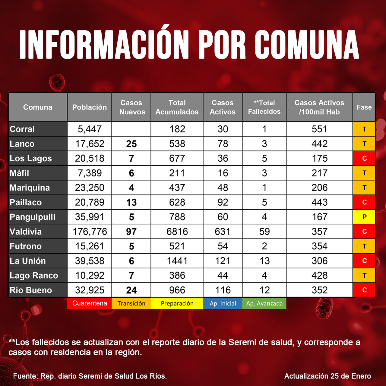 Ahora) En PautalosRios.clRadio: Hoy en la Región Los Ríos Minsal reporta 199 casos de contagio por Covid-19 1454 activos, 6 muertos, 16 % positividad en 1282 exámenes informados. 50 fallecidos enero 2021, 143 total.