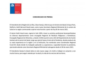 Ahora) Breves del dia En PautalosRios.clRadio : Lo último Ministro de salud, Enrique Paris, Ratificó a Keith Bernard Hood Lewis, como nuevo Seremi Salud en la región de #LosRíos comenzando a ejercer esta función a partir de hoy 05 de marzo 2021. https://t.co/W52xwi1d4E