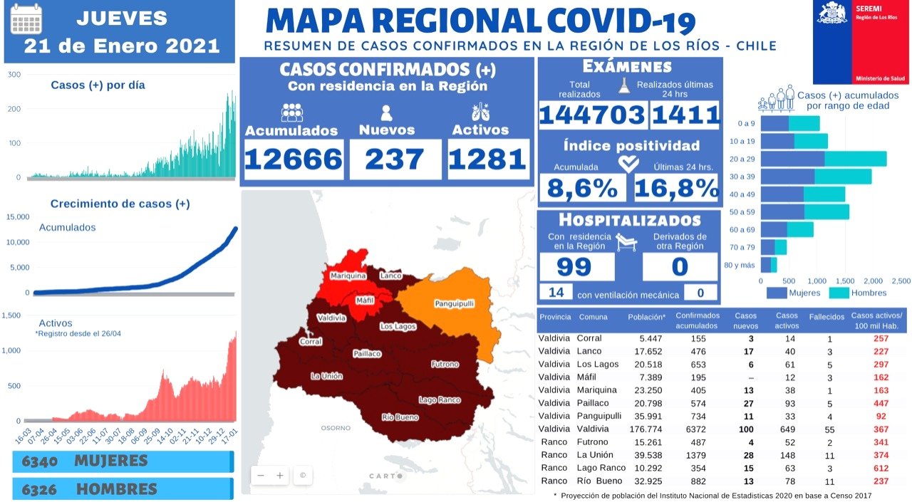 Ahora) En Pautalosrios.clRadio: Reporte del Minsal para hoy reporta 237 casos nuevos , en 1411 exámenes informados 17% de positividad , últimas 24hrs la más alta del pais se informa además de 4 personas fallecidas.