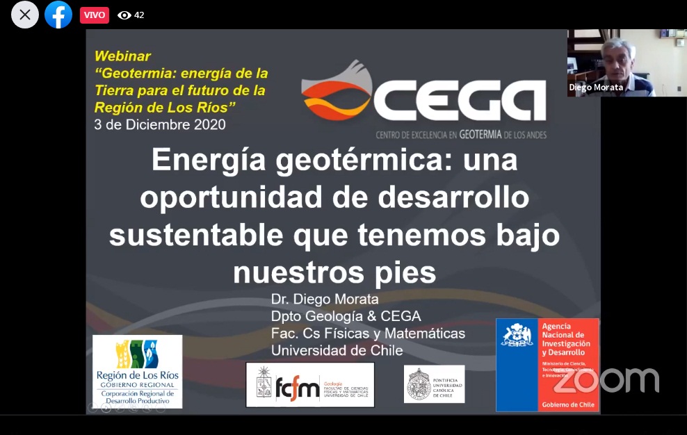 Con destacados expositores se realizó el Webinar sobre Geotermia: Energía de la tierra para el futuro de la región de Los Ríos, organizado por la Corporación Regional de Desarrollo Productivo (CRDP) en conjunto con el Centro de Excelencia en Geotermia de Los Andes de la Universidad de Chile (CEGA), y que buscó orientar a los participantes sobre aspectos generales de esta energía, que concentra un alto potencial en la zona cordillerana de nuestro territorio.
