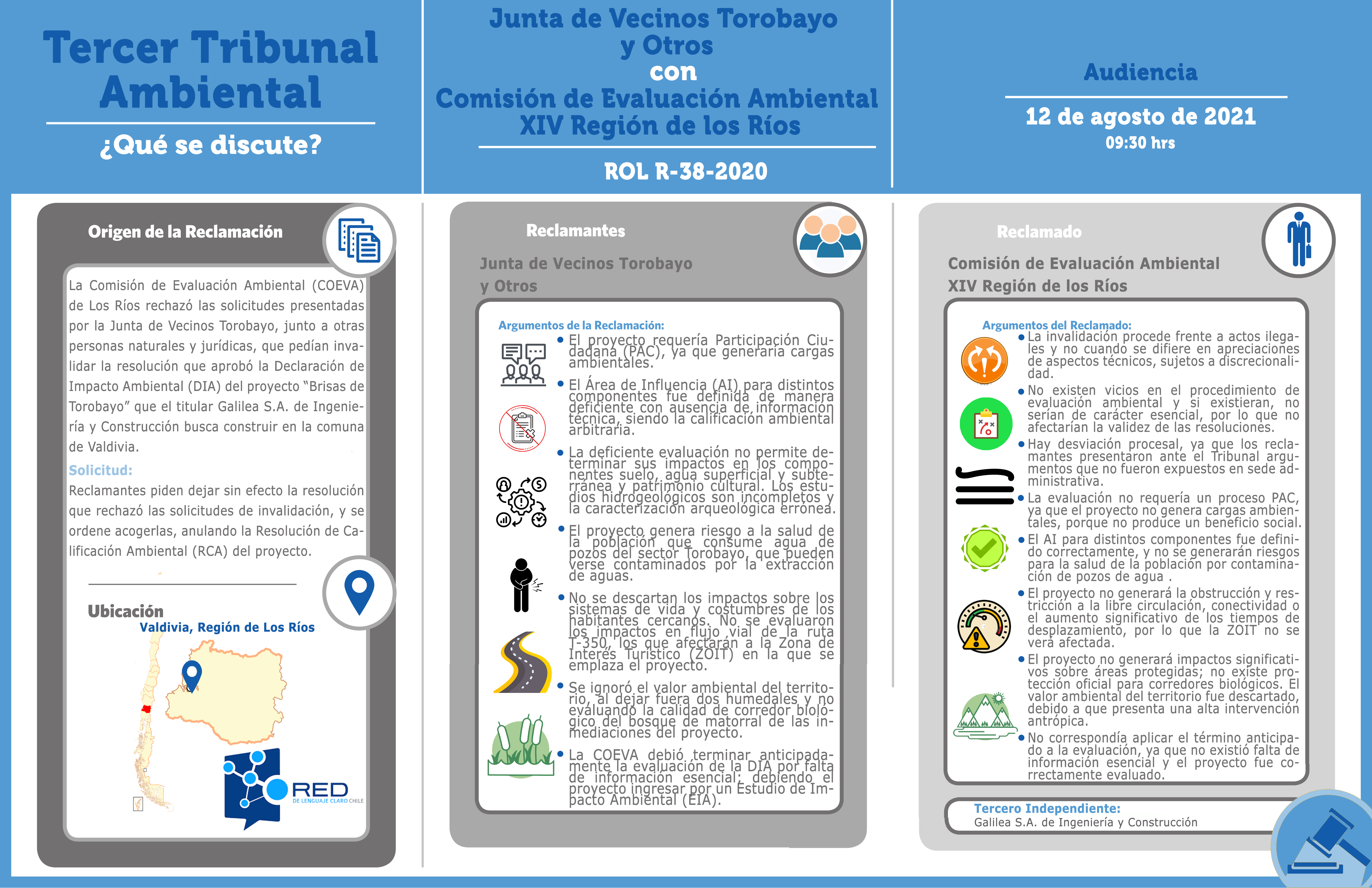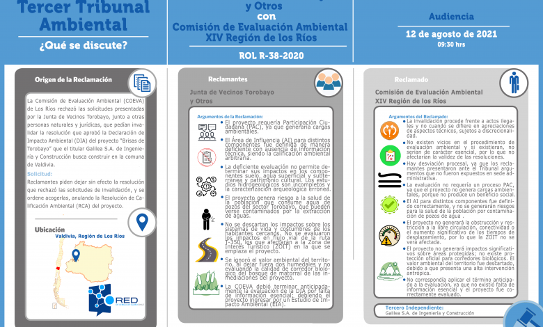 Este miércoles se realizó la audiencia de alegatos en la reclamación interpuesta por La Junta de Vecinos Torobayo de Valdivia y seis personas naturales en contra de la resolución de la Comisión de Evaluación Ambiental (COEVA) de Los Ríos, que rechazó su solicitud de invalidación de la Resolución de Calificación Ambiental (RCA) del proyecto “Hacienda Estancilla”, del titular Inmobiliaria Hacienda Cau Cau SpA.