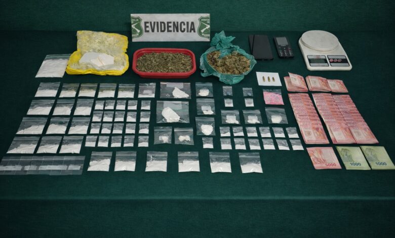 En el lugar, el personal policial incautó 409 gramos de clorhidrato de cocaína, 176 gramos de cannabis sativa, 6,7 gramos de ketamina, 363 mil pesos en dinero en efectivo, diversos elementos destinados a la dosificación de sustancias ilícitas, dos teléfonos celulares, una pesa digital y tres municiones calibre 22.