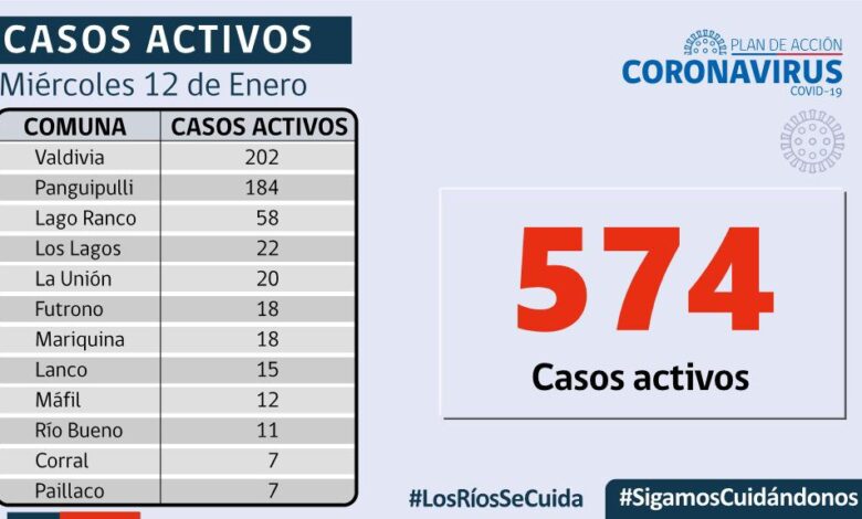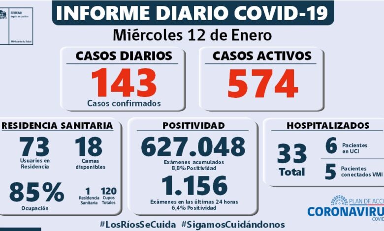 De los 143 casos confirmados por residencia en Los Ríos, 98 corresponden a casos secundarios, 15 están en investigación, 28 aún están sin trazabilidad y 2 casos son importados. En tanto, a la fecha, la región presenta 55.217 casos acumulados, de los cuales 574 corresponden a casos activos, 53.950 a personas recuperadas y 693 a fallecidos.
