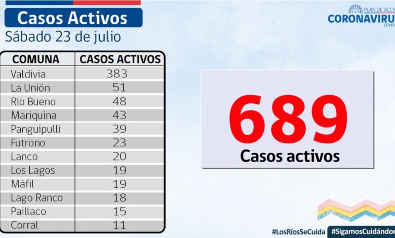 A la fecha, hay 689 casos activos, de los cuales 383 corresponden a la comuna de Valdivia y 51 a la comuna de La Union.